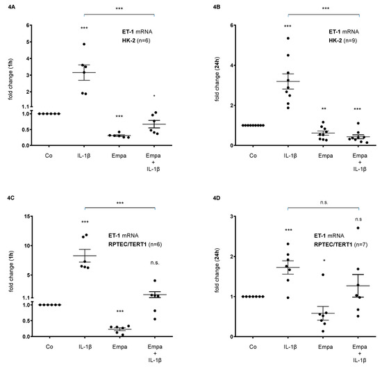 Inhibitory effect of empagliflozin on basal and IL-1β-induced ET-1 mRNA expression in human proximal tubular cells. HPTCs were serum- and supplement-starved for 24 h and then stimulated for 1 h (A,B) or 24 h (C,D) with IL-1β (10 ng/mL), 500 nM Empa, or a combination of Empa (500 nM) and IL-1β (10 ng/mL). Controls (Co) were left unstimulated for 1 h (A,C) or 24 h (B,D). Data are presented as fold induction above ET-1 control levels after normalizing to GAPDH expression. For each experimental condition, data of (n) independent experiments are presented as dots in scatter plot graphs with the respective mean ± SEM bars. (A,B) In HK-2 cells, IL-1β (10 ng/mL) stimulated ET-1 mRNA expression 3-fold (*** p < 0.001, each, when compared with unstimulated control cells) after 1 h (A) and 24 h (B) of ligand stimulation, respectively. Empa (500 nM) downregulated basal ET-1 mRNA expression by 0.3-fold and 0.6-fold after 1 h (A) and 24 h (B), respectively (*** p < 0.001 and ** p < 0.01, respectively, when compared with unstimulated control cells). Co-administration of Empa inhibited IL-1β-mediated ET-1 mRNA expression after 1 h (0.2-fold, *** p < 0.001) (A) and 24 h (0.1-fold, *** p < 0.001) (B). cDNA from n = 6 (A) and n = 9 (B) independent RNA isolations was used for real-time PCR analysis, respectively. (C,D) In RPTEC/TERT1 cells, IL-1β (10 ng/mL) stimulated ET-1 mRNA expression 8-fold and 1.7-fold after 1 h (C) and 24 h (D) of ligand stimulation, respectively (*** p < 0.001, each, when compared with unstimulated control cells). Empa (500 nM) downregulated basal ET-1 mRNA expression by 0.2-fold and 0.6-fold after 1 h (C) and 24 h (D), respectively (*** p < 0.001 and * p < 0.05, respectively, when compared with unstimulated control cells). Co-administration of Empa inhibited IL-1β-mediated ET-1 mRNA expression after 1 h (0.2-fold, *** p < 0.001) (C) and 24 h (0.7-fold, n.s.) (D). cDNA from n = 6 (C) and n = 7 (D) independent RNA isolations was used for real-time PCR analysis, respectively. n.s. = non-significant difference compared to control.