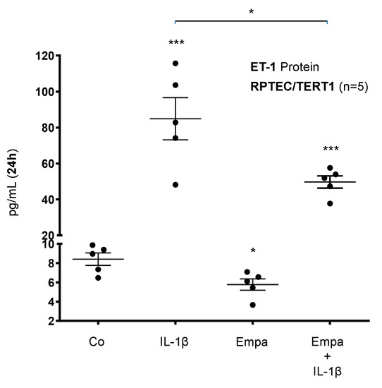 Basal ET-1 protein expression was stimulated by IL-1β (10 ng/mL) (10-fold, p < 0.001) and downregulated by Empa (500 nM) (0.69-fold, p < 0.05) in RPTEC/TERT1 cells after 24 h of incubation. The co-administration of Empa downregulated IL-1β-induced ET-1 protein expression (0.59-fold, p < 0.05) in RPTEC/TERT1 cells (Figure 5).