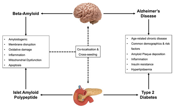 Association between Type 2 diabetes and Alzheimer’s disease. Type 2 diabetes (T2D) and Alzheimer’s disease (AD) are both age-related chronic diseases, affecting the similar populations of people. Both diseases also feature altered metabolism, dysfunctions in insulin signaling, and plaque deposition composed of amyloidogenic peptides such as islet amyloid polypeptide (IAPP) and β-amyloid (Aβ). Similar to the diseases themselves, IAPP and Aβ share many commonalities, which are predominantly shared mechanisms of toxicity. Current research suggests that IAPP and Aβ can co-localize in the brain and pancreatic islets and cross-seed to form IAPP–Aβ heterocomplexes with potentiated toxicity.