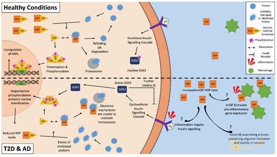 One of the main roles associated with the HSPs is to support protein maintenance, including assisting the proper folding of newly synthesized proteins, refolding and clearance of misfolded and/or aggregated proteins, and participating in the membrane translocation of secretory proteins [24]. As the folding, maintenance, and degradation of proteins are key requirements for cell homeostasis, alterations in the HSR and the associated functions of HSPs have been linked to chronic diseases, such as AD and T2D. In this review, we describe the potential roles for HSPs in AD and T2D pathogenesis.