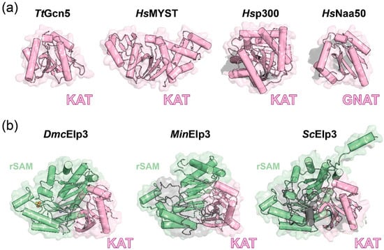 Protein acetyltransferases and Elp3s structures. (a) Structures of KAT domain from TtGcn5 (PDB: 1QSN), HsMYST (PDB: 2PQ8), and Hsp300 (PDB: 5LKT) and the GNAT domain from HsNaa50 (PDB: 6PPL). (b) Elp3 structures from D. mccartyi (PDB: 5L7J), M. infernus (PDB: 6IAD), and S. cerevisiae (PDB: 6QK7). Domains of each enzyme are as indicated.
