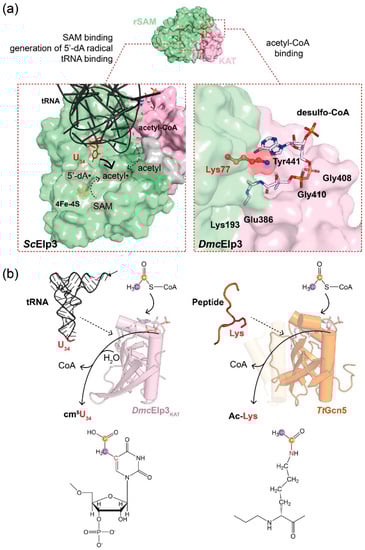 The generation of ac4C is catalyzed by NAT10 [8], whereas the cm5U34 modification reaction is conducted by the Elongator complex [9]. As the catalytic subunit of Elongator (Elp3) shows a high sequence similarity to Gcn5, it was long believed that Elongator acetylates proteins. Only recently was it convincingly shown that it indeed acts as a non-canonical acetyltransferase that catalyzes reactions on tRNAs instead of proteins [10,11,12,13]. In contrast to the formation of a carbamoyl group by common protein acetyltransferases, Elp3 connects the methyl group of the acetyl residue with the C5 atom of the targeted uracil base. This type of reaction is unique to Elp3 proteins and, in addition to a KAT domain, it also requires an additional radical S-adenosyl methionine (rSAM) domain to execute its full modification activity. As the priming cm5U34 modification by Elongator is the first step in some xcm5U34 derivatives formation, ablation of Elongator causes loss of all xcm5U34 derivatives. The lack of these modifications leads to proteome aggregation, proteotoxic stress and the mis-regulation of various key proteins involved in a large variety of cellular functions, including the initially suspected transcription regulation [14]. Furthermore, a reduction in Elongator-dependent tRNA modification has been linked to the onset of severe human pathologies, including cancers and neurological disorders [15]. Here, we aim to provide a comprehensive summary of the recent developments around the highly conserved catalytic Elp3 subunit from bacteria, archaea, and eukaryotes. We focus on the available structural and biochemical details and link these new data to existing clinical evidence. The implications of Elongator dysfunction in various organisms and the pathological consequences of other tRNA modification enzymes are well-summarized by recently published reviews [16,17,18].