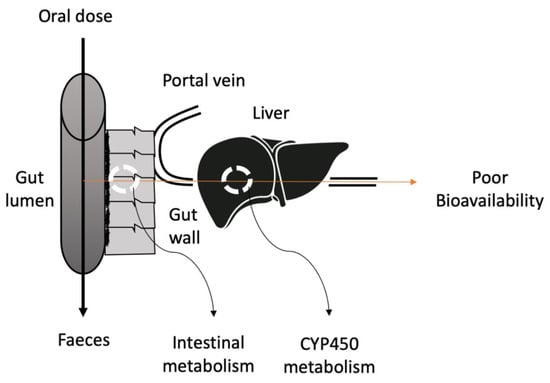 Schematic diagram depicting the route of poor bioavailability after oral administration of the drugs.
