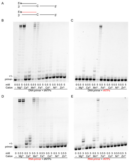 In our attempt to unravel conditions that could enhance the RNA synthetic activity of Polη, we tested the metal ion dependence of both of its DNA and RNA synthetic activities. Besides magnesium, we compared activities in the presence of six other divalent metal cations that had been implicated in enzymatic activation. In in-vitro primer extension assays, each tested cation supported dNMP insertion into both DNA and RNA primers to a varying extent, although Polη exhibited the highest activity in the presence of Mg2+ and Mn2+, lengthening almost all the primers and synthesizing until the end of the template (Figure 1B,D). In the case of each metal cofactor, activation could be detected even at low 0.5-mM metal concentrations, whereas a high 5-mM metal concentration resulted in higher activity. Surprisingly, when the reactions were supplemented with rNTPs instead of dNTPs, activity was observed only with Mn2+ at a 0.5-mM metal ion concentration using either a DNA or an RNA primer (Figure 1C,E). Moreover, Polη exhibited strong activity only in the presence of Mn2+ even at a 5-mM metal concentration, and only a weak activity could be detected with Mg2+, Fe2+, and Co2+, in agreement with our previous results, whereas no activity was detected with the other metals—Ca2+, Ni2+, and Zn2+ [21]. These data suggest that Mn2+ could be the proper cation needed for the activation of the RNA synthetic activity of Polη.