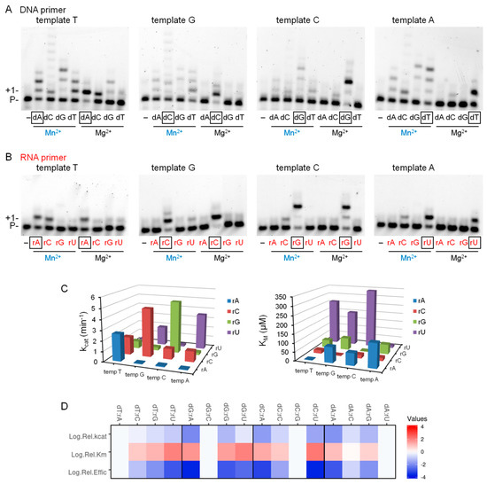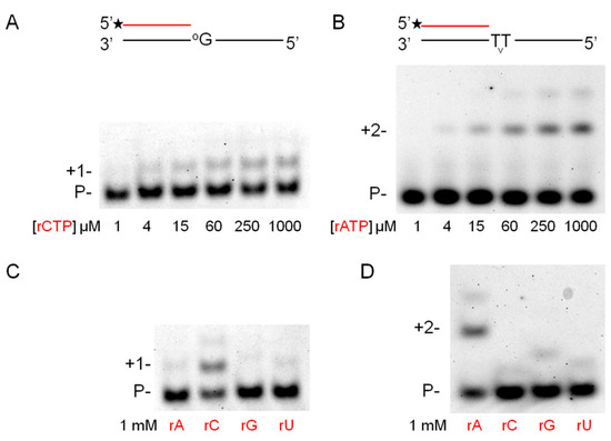 Next, we examined the effect of Mn2+ on the TLS activity of Polη during RNA extension (Figure 4A,B). Our previous results obtained in the presence of Mg2+ revealed a very inefficient bypass of 8-oxoG and TT dimer during RNA extension [21]. Importantly, Mn2+ had a profound effect on insertion that was opposite to both of these damages (Figure S3). Table 1 shows that a ~6000-fold and a ~3000-fold enhancement in TLS efficiency was measured in steady-state kinetic experiments opposite 8-oxoG and TT dimer, respectively, compared to data obtained in the presence of Mg2+. As in the case of undamaged templates and correct incoming nucleotides, the apparent Km values decreased by two orders of magnitude, whereas the Kcat values increased by an order of magnitude with Mn2+. Moreover, Polη kept its fidelity during the bypass reactions as it preferably inserted the correct rNMPs opposite the damage sites and no significant insertions of the incorrect nucleotides were observed (Figure 4C,D). Based on these results, we concluded that Mn2+ was a specific activator of the RNA synthetic activity of Polη both on undamaged templates and opposite DNA damages.