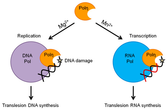 In conclusion, we propose that preferential activation of the DNA or RNA synthetic activity with concomitant impairment of the other through selective metal utilization constitutes a new regulatory mechanism that, with the contribution of other yet unidentified factors, enables Polη to take part in synthesis and DNA damage bypass during replication and also during transcription (Figure 6). Future studies with other polymerases and other enzymes would be necessary to determine the generality of the mechanism. However, since yeast and human Polη exhibit very similar biochemical characteristics during DNA synthesis including processivity, fidelity, damage bypass ability, and human Polη was also shown to be able to utilize rNTPs during DNA extension [23,24,25], therefore it would be of high significance to investigate whether human Polη also has Mn2+-activated specific RNA synthetic and translesion RNA synthesis activities, adding an additional layer to its contribution to genome stability.