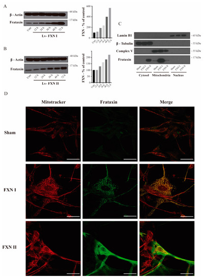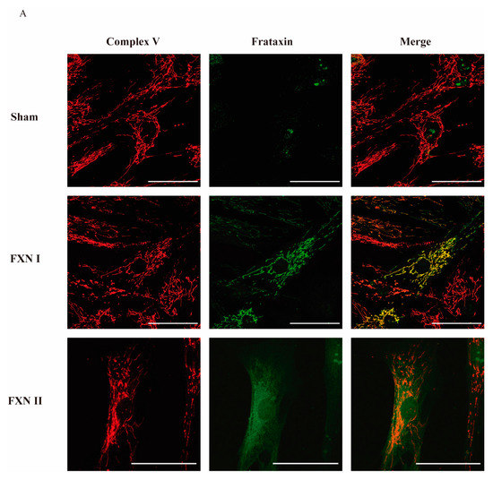 To examine in detail the subcellular localization of frataxin isoforms previously reported in the literature [27], we used two different human cellular models derived from healthy subjects and FRDA patients. Fibroblasts represent a well-established in vitro model for studying FRDA cellular mechanisms [29,30], while olfactory ecto-mesenchymal stem cells (OE-MSCs) are a novel model that has the advantage of being able to be differentiated into several cell types, including neurons [31]. Our lab has extensively worked on the characterization of this cellular model [32]. For this reason, we first transduced OE-MSCs derived from a FRDA patient with the Lv-FXN I (Figure 1A) or the Lv-FXN II (Figure 1B) for 48 h, which allowed us to obtain a frataxin expression level of 200–400% when compared to untreated cells. Then we proceeded with the subcellular fractionation following the protocol described in Materials and Methods [33,34]. To confirm that subcellular compartments were successfully isolated, we examined the expression of Lamin B1 as a nuclear marker, ATP Synthase (Complex V) for mitochondria, and β-Tubulin for the cytosol (Figure 1C). While we did not detect frataxin expression in the nuclear compartment, we were able to confirm the cytosolic localization of FXN II in OE-MSCs, which has a higher molecular weight than the canonical isoform FXN I. To evaluate the cellular localization of the different frataxin isoforms in more detail, we transduced the cells with the two constructs, and analyzed the mitochondrial network and frataxin by immunocytochemistry (Figure 1D). We found that canonical FXN I clearly co-localized with the mitochondrial network of the cells labelled with Mitotracker Red, while FXN II showed a diffuse cytosolic pattern along the cell body. The same conclusions were reached when similar experiments were performed in the other cellular model we analyzed: FRDA-derived fibroblasts (Figure 2A). Cells transduced with Lv-FXN I expressed mature canonical frataxin that co-localized with the mitochondrial network stained with an anti-Complex V antibody, while patient-derived fibroblasts transduced with Lv-FXN II showed a uniform frataxin expression along the cytoplasm of the cell.