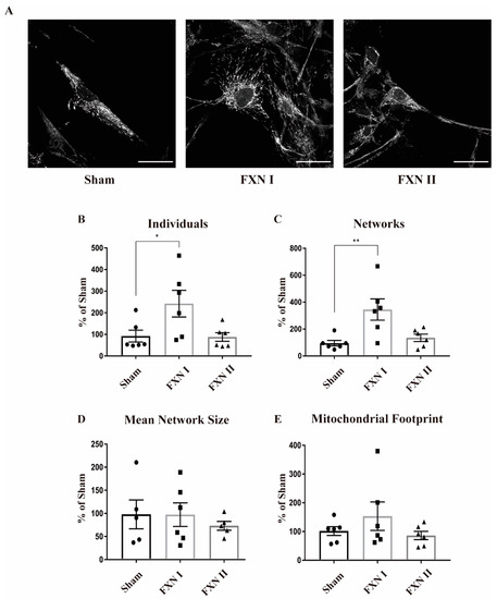 Since frataxin is a key protein for mitochondrial homeostasis, we wanted to study the possible functional differences between FXN I and FXN II in mitochondrial physiology, exploring both network structure and mitochondrial metabolism. There is evidence showing that frataxin overexpression can activate oxidative phosphorylation, which increases the mitochondrial respiration rate in some cellular models [40]. However, it is also known that the overexpression itself can lead to imbalanced biochemical pathways, provoking metabolic dysfunction in several physiological processes in the cell [41,42]. For these reasons, we established an appropriate optimal transduction time of 48 h, allowing frataxin levels to safely rise between 2–4-fold compared to untreated cells, while avoiding potential toxicity derived from sustained overexpression, which has been shown to lead to mitochondrial toxicity in mouse models, starting from 20-fold [43].