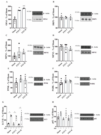 Western blot analysis of mitochondrial dynamics and quality control-related proteins in OE-MS cells. Cells were either left untransduced (Sham) or transduced with Lv-FXN I or Lv-FXN II. (A) Analysis of OPA1 levels in OE-MS patient cells. (B) Analysis of DRP1 levels in OE-MS patient cells. (C) to (D) Analysis of MFN1 and MFN2 levels in OE-MS patient cells. (E) to (F) Analysis of PINK/PARK levels in OE-MS cells. (G) to (H) Analysis of LC3 and p62 levels with and without autophagy inhibitor bafilomycin A1. Data are represented as mean ± SEM and were analyzed with a one-way ANOVA with post hoc Dunnett multiple comparisons test with n = 3. * p < 0.05; ** p < 0.01; *** p < 0.001.