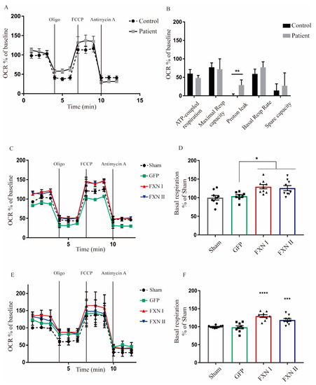 Seahorse assay in OEMS FRDA patients and healthy subjects. (A) Seahorse assay performed in untreated healthy and FRDA patient OE-MS cells showing oxygen consumption rates. The X-axis plots different measurements over time (rates). (B) Normalization of the seahorse results between healthy and patient OE-MSc showing differences in ATP-coupled respiration rate, maximal respiratory capacity, proton leak, basal respiratory rates and spare capacity. (C) Seahorse assay in healthy OE-MS cells either non-transduced or transduced with lentiviral vectors codifying for FXN I, FXN II or GFP as positive transduction control. The X-axis plots different measurements over time (rates). (D) Normalization of basal respiration levels in healthy OE-MS cells after transduction with frataxin isoforms. (E) Seahorse assay in patient OE-MS cells either non-transduced or transduced with lentiviral vectors codifying for FXN I, FXN II or GFP as positive transduction control. The X-axis plots different measurements over time (rates). (F) Normalization of basal respiration levels in FRDA patient OEMS cells after treatment with frataxin isoforms. Data are represented as mean ± SEM and were analyzed with a one-way ANOVA with post hoc Dunnett multiple comparisons test from at least three independent experiments from independent cell culture preparations (n = 3). * p < 0.05; ** p < 0.01; *** p < 0.001; **** p < 0.0001.