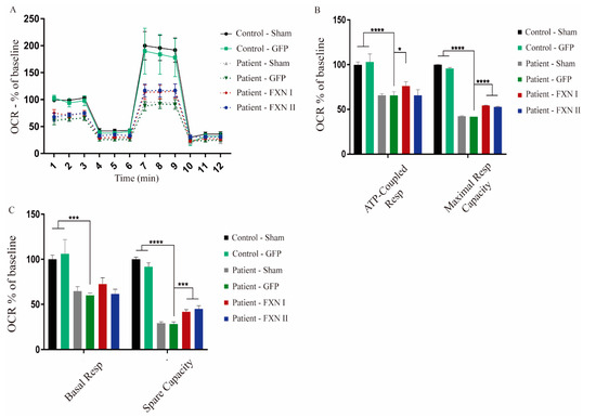 Seahorse assay in fibroblasts isolated from three FRDA patients and two healthy control subjects. (A) Representation of the oxygen consumption rate (OCR) in fibroblasts either non-transduced, or transduced with FXN I, FXN II or GFP as a positive transduction control. Patient cells transduced with frataxin isoforms seem to perform better on the assay, getting closer to the healthy cell OCR values. The X-axis plots different measurements over time (rates). (B) Relative quantification of the values of ATP-coupled respiration and of maximal respiratory capacity. Significant improvements in maximal respiratory capacity can be detected in patient fibroblasts after transduction with both frataxin isoforms. (C) Relative quantification of the values of basal respiratory capacity and spare capacity in both control and patient fibroblasts transduced with both isoforms. Data are represented as mean ± SEM and were analyzed with a one-way ANOVA with post hoc Dunnett multiple comparisons test from at least three independent experiments per cell line (n = 3). * p < 0.05; *** p < 0.001; **** p < 0.0001.