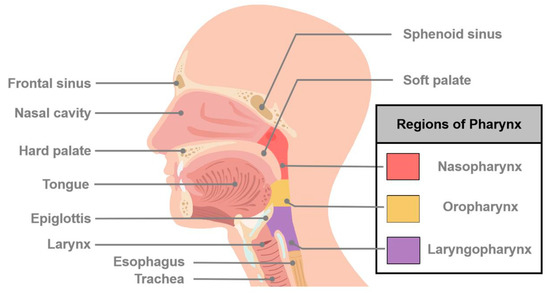 Schematic diagram of major sites of cancers of head and neck. Head and neck cancer (HNC) is a general term that describes many different types of cancers and involves multiple organs and tissues within the head and neck region. HNCs generally occur in the oral cavity, oropharynx, hypopharynx, nasopharynx, larynx, and nasal cavity.