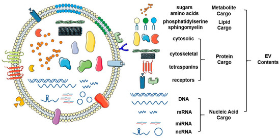EVs are functional nanovesicles that are deliberately packaged and secreted by physiologically normal and pathological cells. They are enclosed by natural lipid bilayers and segments of cell membranes that are clipped off during EV formation [7]. EVs harbor molecular cargo that directly reflects their cell of origin and are increasingly recognized as major drivers of cell-cell communication (Figure 2) [8]. These small packages specifically target recipient cells and relay signals via cell surface receptors and/or transfer of their contents directly and deliberately. Their abilities to protect their molecular cargo and provide a safe mode of transport to distant sites throughout the body underscore their importance in carcinogenesis and tumor development (Figure 3).