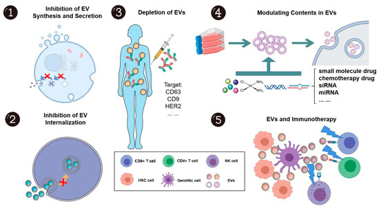 As EVs play a significant role in HNC carcinogenesis, development, and progression, many researchers have considered their capacity as therapeutic targets and novel drug delivery systems (Figure 5).
