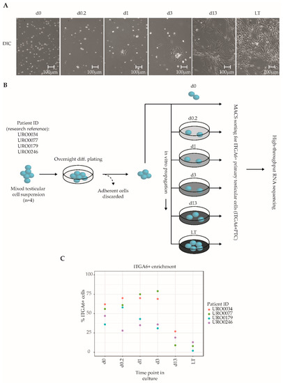 Primary testicular cells (PTC) were isolated from cryopreserved testicular tissue biopsies (n = 4 different donors) and propagated in vitro for up to two months, which is the postulated culture duration required to obtain sufficient cell numbers for successful transplantation based on human to mouse xenotransplantation experiments [21,22]. A total of six culture time points were analyzed in the current study: At the onset of culture to get the cells settled day 0 (d0), after 4 h (d0.2), 24 h (d1), to an almost complete monolayer before first passage at 72 h (d3) and then at two weeks (d13) and two months after 5–6 passages (LT, long-term). The chosen time points reflect distinct morphological changes of the PTC culture. During culture, we observed a notable transition from mostly floating, round cells at the onset of culture to a pronounced monolayer of attached spindle-shaped cells from day 13 onwards, with a smaller population of round germ cells adhering to the monolayer (Figure 1A, Video S1), consistent with previous studies that have reported similar transitions [21,22,29,35]. Throughout culture, PTCs were enriched for SSCs through MACS sorting for ITGA6+ cells, resulting in SSC-enriched PTC fractions (hereafter termed ITGA6 + PTC) obtained at six culture time points from four unique testicular tissue donors (total of 24 fractions) (Figure 1B). Consistent with the aforementioned reduction in the ratio of round germ cells as compared to adherent spindle-shaped somatic cells, we detected a significant reduction in the percentage of ITGA6 + PTCs as compared to unsorted PTC with increasing culture time (mean ± SD; 60% ± 16% at day 0 to 6% ± 5% after long-term culture) (Figure 1C).