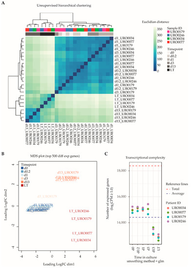 Next, we generated transcriptional data sets of ITGA6 + PTCs throughout culture by RNA-Seq, spanning a total of 18,380 unique RefSeq-annotated gene identifiers after data normalization and filtering. Unsupervised hierarchical clustering analysis based on total transcriptomic profile revealed separation of samples into three distinct groups according to time in culture (Figure 2A), namely d0–d3, d13 and LT-ITGA6 + PTCs. This was further substantiated by measuring the distance between samples based on the top 500 most variable genes (Figure 2B). The transcriptional changes associated with in vitro propagation did not appear to occur linearly, since d13-ITGA6+PTCs clustered further away from d0-ITGA6 + PTCs as compared to LT-ITGA6 + PTCs. Following the observed clustering pattern, differential gene expression analysis revealed a substantial increase in the number of differentially expressed genes (DEG) when comparing successive ITGA6 + PTCs per patient during culture (Figure S1). In addition to increased differential expression in d13-ITGA6 + PTCs and LT-ITGA6 + PTCs, a significant decrease in transcriptional complexity was observed with increasing culture time (p = 1.25 × 10−11, one-way ANOVA test). Compared to 14,985 total transcripts with a logarithmic counts-per-million (log2CPM) score of ≥1 at d0 in culture, the number of expressed transcripts was significantly reduced in d13 (13,345 transcripts, p ≤ 0.01, Tukey HSD test) and LT (12,772 transcripts, p ≤ 0.01, Tukey HSD test) cultures (Figure 2C).