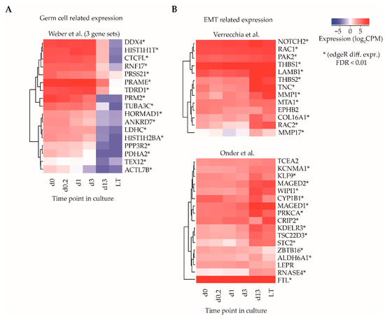 Gene set enrichment analysis for identification of sets of functionally related genes. (A) Average log2CPM of gene identifiers in three gene sets described by Weber et al., correlating to transcriptional differences between germ cells and fibroblasts and (B) two gene sets described by Verrecchia et al. and Onder et al., relating to epithelial-to-mesenchymal transition (EMT) transcriptional signatures. Asterisks indicate whether the gene was differentially expressed (edgeR, adjusted p-value cut off (FDR) ≤ 0.01).