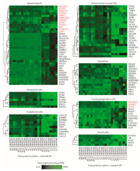 To obtain a more robust estimate of the ratio in which particular cell types of both germ cell and somatic cell lineages might be present in ITGA6 + PTC cultures, we next analyzed a list of cell type specific marker genes associated with several predominant cell types found in the seminiferous epithelium and surrounding interstitium within the in vivo testis or in vitro in long term PTC cultures (spermatogonia, Sertoli cells, (progenitor) Leydig cells, peritubular myoid cells, fibroblasts and mesenchymal stromal cells) (Table S1) [25,34,41,42,43,44,45,46,47,48,49,50,51]. By carefully reviewing the literature, we identified a total of 106 genes as selective biomarkers for these cell types and analyzed expression levels of these genes at various time points during culture in more detail (Figure S2). Remarkably, while gene expression levels follow a consistent pattern of all selected genes for most cell types, this was not the case for spermatogonial and (progenitor) Leydig cell marker genes, which clustered into two separate subgroups of markers characterized by a major set of genes with concurrent gene expression levels and a smaller set of outlier genes based on their expression during culture (Figure 4). Of the analyzed spermatogonial markers, 12/35 genes (POU2F2, ENO2, SPOCD1, CHEK2, FMR1, ZKSCAN2, GPR125, ITGB1, UCHL1, KIT, EXOSC10, CD9) displayed expression values inconsistent with the remaining 23/35 markers and were upregulated rather than downregulated during culture. Similarly, 3/12 (progenitor) Leydig cell markers (PDGFRA1, IGFBP5, STAR) were upregulated during culture, while the remaining 9/12 showed a heterogeneous expression pattern between samples (Figure 4).