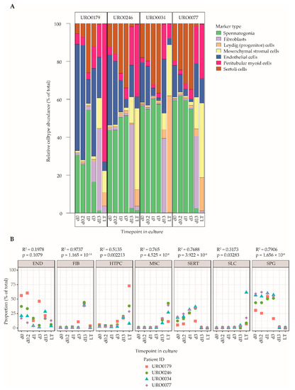 Finally, a cell type deconvolution analysis using CellMix [52], was performed to estimate cell type proportions in ITGA6 + PTCs during culture using the marker genes defined in Table S1 and excluding outlier genes as identified in Figure 4. In line with the differential gene expression analyses and gene set enrichment data, this analysis revealed an altered cell type composition profile in d13-ITGA6 + PTCs and LT-ITGA6 + PTCs as compared to d0-ITGA6 + PTCs, characterized by a reduction in the proportion of spermatogonia in favor of somatic cell types (Figure 5A). Specifically, in d0-ITGA6 + PTCs, the predominant expression patterns correspond mostly to cells of spermatogonial and endothelial lineages, and to a lesser extent, peritubular myoid cells and Sertoli cells. In contrast, the expression profile of the spermatogonial and endothelial markers were both greatly decreased in d13-ITGA6 + PTCs and LT-ITGA6 + PTCs while the signature of mesenchymal stromal cells and peritubular myoid cells increases significantly (Figure 5B). Fibroblasts were detectable in d13-ITGA6 + PTCs but not in LT-ITGA6 + PTCs. Progenitor Leydig cells were almost undetectable in d0-ITGA6 + PTCs up to d13-ITGA6 + PTCs and showed variable abundance between LT-ITGA6 + PTC samples. The expression profile associated with Sertoli cells initially increased at the early time points (d0.2, d1 and d3), followed by a steep decline in d13-ITGA6 + PTCs and LT-ITGA6 + PTCs. Despite some variation between patient samples, the general picture pointing towards a decrease in spermatogonial percentages and a more mesenchymal cell type signature is evident in all patient samples.