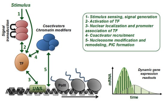 The modulation of gene expression is a key feature of all living organisms and permits the adjustment of the protein composition of a cell in response to infinite environmental cues or during differentiation processes [,,]. Traditionally, the expression rate of a gene has been measured by the quantification of its product, either mRNA or protein, using invasive methods, which generally impede the detection of the true dynamic nature of gene expression regulation. In the past decades, numerous approaches have been developed to study gene expression in real time and in the living cell by the introduction of different fluorescent or bioluminescent reporters or in situ hybridization techniques. This has greatly advanced our perception of the highly dynamic nature of transcriptional regulation [,]. It is clear now that the dynamics of transient gene expression is crucial for the appropriate cellular adaptation to changing environments [], as is the timing and pattern of gene regulation fundamental for the fate of developmental programs []. In eukaryotic organisms, the activation of gene expression is a multistep process including transcription factor (TF) association with upstream control regions or enhancers, chromatin modification and remodeling, recruitment of co-activators and RNA polymerase, transcriptional elongation and termination, mRNA modification, and nuclear export. At each of these steps, gene expression dynamics can be modulated for specific genes. Please refer to excellent reviews for the mechanistic details of eukaryotic gene expression regulation in general [,,,], which is not the aim of this overview. In this review, we will focus on the molecular steps, from signal transduction to active gene transcription, which confer dynamic gene- and cell-specific regulation (Figure 1). We will summarize the mechanisms that modulate the expression rates of genes according to different physiological determinants of the organism and compare methods for the in vivo determination of dynamic gene expression.