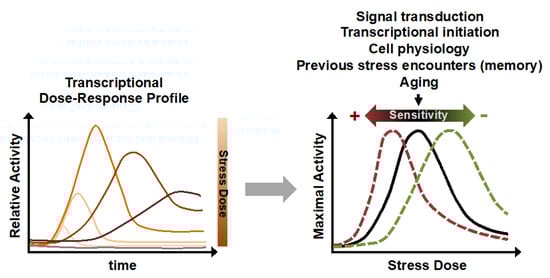 There are many factors which modulate the DR profile of the same or of different genes and cause shifts towards more or less sensitive behaviors (Figure 2). One is the intrinsic promoter structure. Quantitative studies in yeast populations have shown that different promoters have distinguishable sensitivities towards the same abiotic stresses such as osmotic or oxidative challenges, resulting in different half-maximal stimulus concentrations []. It has been recently elucidated that the dynamic of a transcriptional stress response is modulated at both levels of transcription rate and duration and that the gene expression output is modulated at different stages by multiple genetic determinants []. Detailed studies of specific inducible yeast promoters have been undertaken successfully to improve the accessibility and affinity of TF binding sites in artificial promoters to create gene expression responses with altered dynamics [,,].