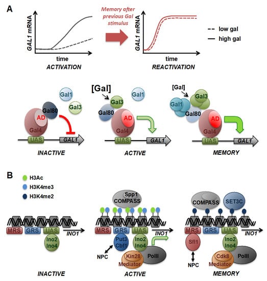 An important mechanism that changes the expression dynamics of genes is epigenetic transcriptional memory. This phenomenon has been found in many organisms and describes the fact that a response to a previous environmental stimulus alters the dynamics of gene expression upon subsequent stimulation [,]. These heritable changes normally last during several cell generations and might permit the organism to respond faster and more efficiently to periodically occurring environmental challenges. For example, human cells memorize past infections by favoring interferon-γ-mediated gene induction [], and plants show an enhanced transcriptional response to heat shock several days after a previous heat stress [,,]. Budding yeast has been used very extensively in transcriptional memory investigation, because several nutritional changes induce profound memory effects, which can be easily studied in depth in this organism. Two genetic systems and environmental conditions have been mainly applied in yeast: the induction of the GAL genes (encoding the enzymes necessary for galactose utilization), which show strong epigenetic memory upon repeated exposure to galactose, and the expression of the INO1 gene (encoding inositol-1-phosphate synthase), which is activated by inositol starvation and potentiated upon previous inositol deprivation (Figure 3).