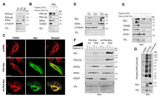 PKA influences mitochondrial functions through phosphorylation of several targets [49,50,51]. PKA signaling has distinct targets and biological effects inside and outside mitochondria [52]. The role of PKA localized inside mitochondria remains, however, poorly understood. We first examined endogenous expression and subcellular localization of PKA in HeLa cells. Previous works have shown that PKA subunits are present in multiple cellular compartments, including mitochondria [16,53,54]. Similarly, our findings showed that PKA-RI-α/β and PKA-C-α subunits are present in both cytosolic and mitochondria-enriched fractions (Figure 1A). To examine the localization of PKA subunits among the mitochondrial subcompartments, we then performed trypsin sensitivity on mitochondria-enriched fractions. Treatment of mitochondria with trypsin led to strong degradation of the RI-α/β subunits similar to the OMM protein TOM20 (Figure 1B). In contrast, the PKA-C-α subunits resisted to trypsin proteolysis similar to the IMM/matrix protein SDHa (Figure 1B). These results thus suggest that a significant pool of PKA-C-α resides inside mitochondria of HeLa cells.