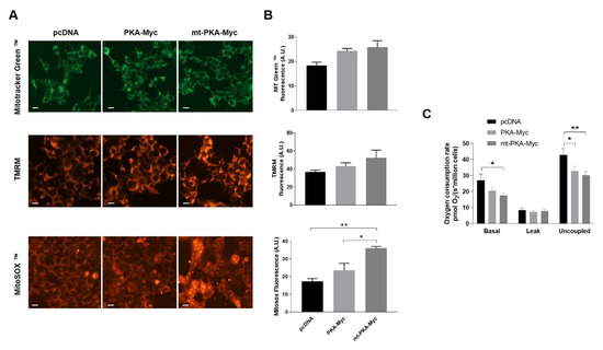 In order to evaluate the functional impact of mt-PKA, HeLa cells were transfected with pcDNA, PKA-Myc or mt-PKA-Myc and labeled with different probes to examine mitochondrial physiology. Live imaging of cells stained with MitoTracker Green™ and TMRM indicated no difference of mitochondrial mass and membrane potential among cells expressing pcDNA, PKA-Myc or mt-PKA-Myc (Figure 2A,B). MitoSOX™ fluorescence indicated higher levels of superoxide in cells expressing mt-PKA-Myc (Figure 2A,B). Overexpression of mt-PKA-Myc significantly decreased basal and uncoupled respiration rates (Figure 2C). PKA-Myc had a similar impact on respiration although only uncoupled respiration was significantly reduced by this construct (Figure 2C). Overall, these findings suggest that the overexpression of intramitochondrial PKA-C-α alters mitochondrial functions.