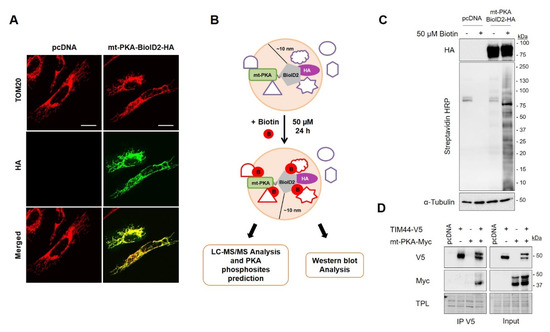 Although it is still debated, evidence suggest that PKA is localized within mitochondrial matrix where it can directly target proteins and modulate the activity of the organelle [38,39]. The aim of the present work was to characterize the interactome of PKA specifically targeted to the mitochondrial matrix using BioID. Our findings indicate that the overexpression of mt-PKA decreases cellular respiration and increases superoxide levels. Twenty-one mitochondrial proteins were then identified as potential substrates of mt-PKA using BioID, LC-MS/MS and in silico phospho-site prediction. Using coimmunoprecipitation, we confirmed the interaction of mt-PKA-Myc with TIM44-V5. The phosphodeficient mutant of TIM44-S80 negatively impacted cellular respiration and strengthened the interaction between mt-PKA and TIM44 constructs. Future studies will be needed to understand whether potential phosphorylation of TIM44-S80 affects the functions of the protein and its capacity to import proteins across the IMM.