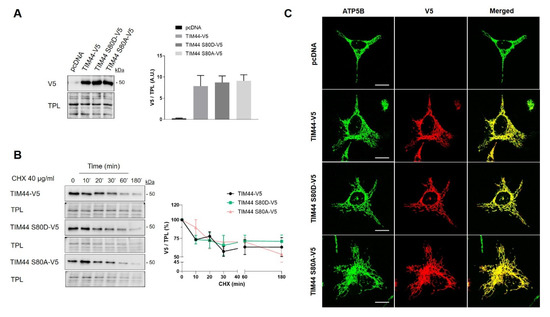 The role of TIM44-S80 phosphorylation in mitochondrial physiology was then examined using phosphomimetic TIM44-S80D-V5 and phosphodeficient TIM44-S80A-V5 mutants. Immunoblotting revealed similar levels of TIM44-V5 variants, suggesting that TIM44-S80 phosphomutations do not impact on TIM44 level (Figure 4A). Cycloheximide treatment followed by Western blotting showed similar degradation rates of TIM44-V5 and phosphomutants (Figure 4B), indicating that the stability of TIM44-V5 is not affected by TIM44-S80 phosphomutations. Similarly, TIM44-S80 variants were all correctly imported inside mitochondria since they colocalized with the mitochondrial protein ATP5B (Figure 4C). Altogether, these findings suggest that the potential phosphorylation of TIM44-S80 would not alter TIM44 homeostasis.
