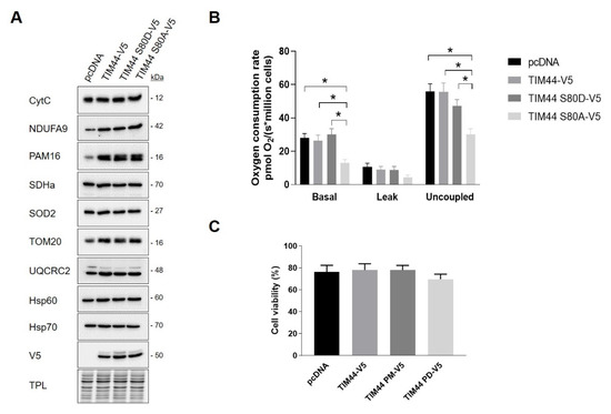 In order to assess the impact of TIM44-S80 phosphomutations on mitochondria, several proteins located in different mitochondrial compartments and involved in different mitochondrial functions were examined in HeLa cells expressing pcDNA or TIM44 variants. Immunoblottings showed that the level of these proteins remained unchanged among TIM44 mutants, suggesting that the phosphomutations of TIM44-S80 do not impact on mitochondrial content (Figure 5A and Figure S1A). Next, we examined the impact of these phosphomutations on cellular respiration and viability. We observed that the expression of the phosphodeficient TIM44-S80A-V5 mutant significantly decreased basal and uncoupled respiration rates (Figure 5B). These results suggest that phosphorylation of TIM44-S80 is needed to maintain optimal respiration. Trypan blue exclusion assay revealed that phosphomutants of TIM44-S80 did not affect cellular viability (Figure 5C). Overall, our findings suggest that the phosphorylation status of TIM44-S80 could impact on OXPHOS.