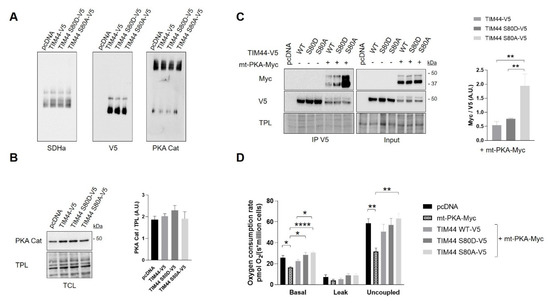 Functional interaction between TIM44-V5 phosphomutants and mt-PKA. (A) Representative BN-PAGE immunoblots (n = 4) of SDHa, V5 and PKA catalytic (Cat) subunit in TCLs of HeLa cells expressing empty vector (pcDNA), TIM44-V5, TIM44 S80D-V5 or TIM44 S80A-V5. See Figure S1B for quantifications. (B) Left, representative immunoblots (n = 4) of PKA catalytic (Cat) subunit levels and (right) corresponding quantifications on total protein loads (TPL) in total cell lysates of HeLa cells expressing empty vector (pcDNA), TIM44-V5, TIM44 S80D-V5 or TIM44 S80A-V5. (C) Left, representative immunoblots (n = 5) and (right) quantification of coimmunoprecipitated V5 with Myc from total cell lysates of HEK cells expressing pcDNA, TIM44 phosphomutants and/or mt-PKA-Myc. TPL: total protein load. Data were analyzed by one-way ANOVA followed Tukey’s post hoc test (** p < 0.01). (D) Basal, leak and uncoupled cellular respiration (n = 5) of HeLa cells expressing empty vector (pcDNA), mt-PKA-Myc, or co-expressing TIM44-V5, TIM44 S80D-V5 and TIM44 S80A-V5 with mt-PKA-Myc. Data were analyzed by two-way ANOVA test followed by Tukey’s post hoc test (* p < 0.05, ** p < 0.01, **** p < 0.0001).