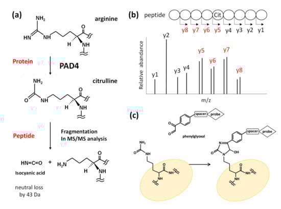 Mass spectrometry (MS) effectively analyzes posttranslational modifications without using specific antibodies. Recent developments in MS-based analyses have provided few methods to detect citrullinated proteins. It is difficult to detect specific citrullinated residues in proteins using conventional MS/MS analyses because the technique should be able to detect minute differences in the molecular mass between arginine and citrulline, which is only 0.98 Da; however, citrulline residues release an isocyanidine group via fragmentation reaction during MS/MS analysis. Thus, citrulline residues in a protein can be efficiently identified by detecting a 43 Da difference in the molecular mass, which corresponds to the neutral loss of the isocyanidine group (Figure 1a,b) [37].