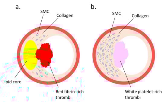 Two major lesions that lead to thrombus formation: (a) plaque rupture and (b) plaque erosion—are illustrated. (a) A vulnerable plaque is characterized by a large lipid core covered by a thin fibrous cap. When the fibrous cap is ruptured, red thrombus is produced. (b) A plaque erosion is characterized by a thickened intima enriched with smooth muscle cells (SMCs) and collagen fibers. When endothelial cells are injured, white-platelet-rich thrombus is produced.