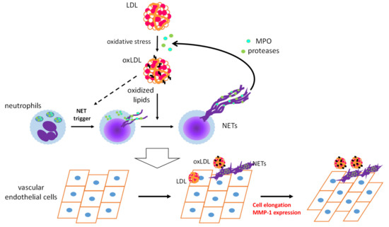 Schematic diagram of a feed-forward cascade that drives the neutrophil extracellular trap (NET)-induced endothelial inflammatory response. OxLDL strongly accelerates NET formation of activated neutrophils, while the same NET formation-inducing effect of oxLDL on resting neutrophils has not been observed. MPO and proteases released from neutrophils by NET formation could act on native low-density lipoprotein (LDL) to facilitate modification of LDL. Coexistence of NETs and oxLDL or native LDL promotes endothelial inflammation to cause cell elongation and enhanced MMP-1 production in endothelial cells [119]. MPO: myeloperoxidase, MMP-1: matrix metalloproteinase-1.