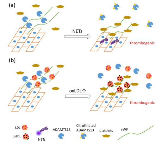 The synergistic actions of NET formation and oxLDL production presumably cause a proatherothrombotic status on the vascular endothelium. (a) PAD4 secreted by NET formation mediates citrullination of ADAMTS13, which inhibits the proteolytic activity of ADAMTS13 against von Willebrand factor (vWF), leading to increased vWF-platelet string formation on the endothelium [41]. (b) LDL, identified as a novel vWF-binding partner, accelerates the proteolytic cleavage of ultra-large vWF by ADAMTS13 under shear stress, and inhibits adhesion of platelets to ultra-large vWF. OxLDL, having lower ability to enhance proteolytic activity of ADAMTS13 than native LDL, competes with native LDL, which in turn increases platelet adhesion to ultra-large vWF, which could cause thrombus formation rich in vWF, platelets, and DNA [121].