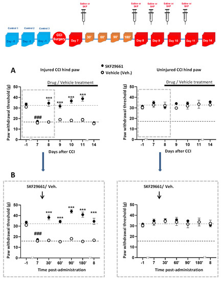 Effect of SKF29661 on mechanical allodynia from chronic constriction injury (CCI) animals. A graphical scheme of the experimental design is depicted on top of the figure. SKF29661 (300 mg/kg in 250 µL) or vehicle (saline) were injected intraperitoneal (I.P.) every 24 h (approximately at noon) for four consecutive days to CCI animals starting at day 7 after CCI surgery. Pre-CCI values (designated as −1) were taken as the mean of three consecutive determinations performed on days −5, −3, and −1 with regard to CCI surgery. Pharmacological testing was conducted on days 7–14 after surgery. Behavioral evaluation was generally performed 24 h after drug/vehicle administration (A) and also at 30 min, 60 min, 90 min, and 180 min following the first administration of SKF29661 (B). Data are expressed as the mean ± SEM of 6 (vehicle) or 12 (SKF29661) animals. Statistical significance was assessed by two-way ANOVA for repeated measures followed by a Tukey post hoc test for comparisons at matched times (***: p < 0.001). The statistical significance of the effect of CCI (7 days after CCI) with respect to pre-CCI values (−1) was evaluated by a one-way ANOVA for repeated measures followed by a Tukey post hoc test. (###: p < 0.001 for 7 days after CCI with respect to pre-CCI values (−1)).