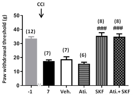 Contribution of α2 adrenergic receptors to mechanical allodynia from CCI animals. The effect of atipamezole (1 mg/kg, I.P.; Ati.) and vehicle (saline; Veh.) on mechanical allodynia was evaluated in the CCI-injured hind paw 30 min after their administration to both naive and SKF29661-treated (300 mg/kg, I.P.; SKF) animals. Pre-CCI (−1) values were taken as the mean of three consecutive determinations performed on days −5, −3, and −1 with regard to CCI surgery. Pharmacological evaluation was conducted on days 7–21 after surgery. Data are expressed as the mean ± SEM of the number of animals, which is shown between parentheses for each condition. Statistical significances of the drug’s effects were assessed with respect to vehicle by using a Student’s t-test for independent samples (###: p < 0.001).