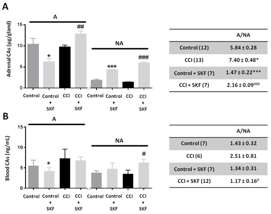 Effect of SKF29661 on adrenal and blood catecholamines (CAs) from Control and CCI animals. Animals were sacrificed between day 7 (CCI) and day 11 after CCI (at the end of treatment with SKF29661). Bar graphs represent A and NA content of the adrenal gland (A) or blood A or NA levels (B) for each condition. The number of glands (1 gland per animal) or blood samples and the A/NA for each condition is shown between parentheses in the accompanying tables. Data are expressed as mean ± SEM. Statistical significances with respect to Control (*: p < 0.05; ***: p < 0.001) or to CCI (#: p < 0.05; ##: p < 0.01; ###: p < 0.001) were assessed by a Student’s t-test for independent samples. Non-significant differences (p > 0.05) are not shown. A: Adrenaline; NA: Noradrenaline; SKF: SKF29661.