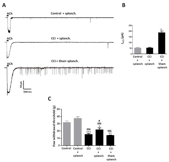 Effect of splanchnectomy on synaptic activity in chromaffin cells and mechanical allodynia from CCI animals. (A) Representative currents evoked by ACh (100 µM, 50 ms; see horizontal bar on top of the recordings) and spontaneous excitatory postsynaptic currents (sEPSCs) recorded in chromaffin cells from a Control animal subjected to splanchnectomy (Control + splanch.; upper record), a CCI animal subjected to splanchnectomy (CCI + splanch.; middle record), and a CCI animal subjected to sham splanchnectomy (CCI + Sham splanch., lower record). Vh = −80 mV. (B) Peak amplitudes of currents evoked by ACh (IACh) in chromaffin cells from Control animals subjected to splanchnectomy (Control + splanch; n = 17 cells), CCI animals subjected to splanchnectomy (CCI + splanch; n = 15 cells), and CCI animals subjected to sham splanchnectomy (CCI + Sham splanch; n = 10 cells). *: p < 0.05 with regard to CCI + splanch (unpaired Student’s t-test). C. Paw withdrawal thresholds to mechanical stimulation in Control animals (Control; n = 9 rats), Control animals subjected to splanchnectomy (Control + splanch; n = 8 rats), CCI animals (CCI; n = 10 rats), CCI animals subjected to splanchnectomy (CCI + splanch; n = 6 rats), and CCI animals subjected to sham splanchnectomy (CCI + Sham splanch; n = 2 rats).*: p < 0.05; **: p < 0.01; ***: p < 0.001 with regard to Control. $$$: p < 0.001 with regard to Control + Splanch. #: p < 0.05 with regard to CCI (unpaired Student’s t-test).
