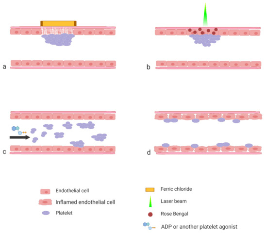 The first category consists of the protocols wherein thrombosis is induced by means of a controlled injury to the vascular wall. The second category consists of protocols wherein platelet activation is triggered by the systemic injection of a specific agonist. Both of the two aforementioned groups of protocols serve to study the mechanisms of thrombosis and to test the efficacy of potential antiplatelet and antithrombotic compounds. The third category, which is the most heterogeneous, includes studies aimed at interactions of platelets with the mechanically intact vascular wall. These protocols are most often applied in studies of the platelet’s role in inflammation, atherosclerosis development or metastasis.