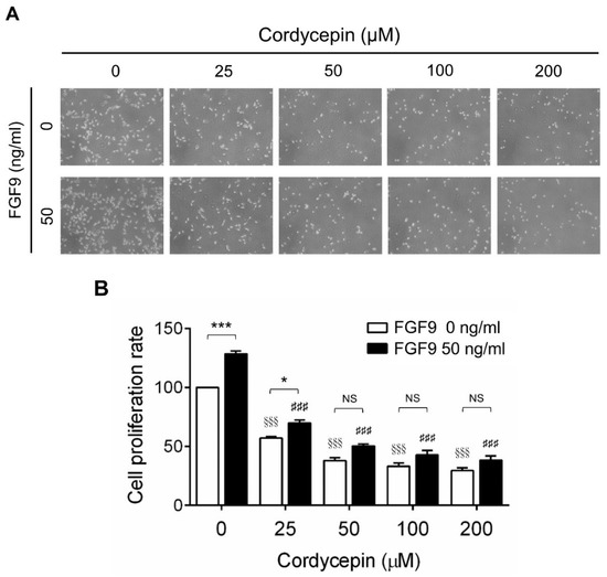 Inhibition of the FGF9-induced cell proliferation of MA-10 cells by cordycepin. (A) Morphology observations of MA-10 cells under an optical microscope (400×) after treatment without or with FGF9 (50 ng/mL) and/or different concentrations of cordycepin (0, 25, 50, 100 and 200 μM) for 24 h. (B) Trypan blue exclusion assay of MA-10 cell proliferation rates after treatment. Quantitative values are shown as the mean ± SEM, n = 4. p values were calculated using two-way ANOVA with Tukey’s multiple comparisons post-tests. * p < 0.05, *** p < 0.001 compared to the control group (0 ng/mL FGF9) at each dose of cordycepin; §§§ p < 0.001 compared to the group with 0 μM cordycepin and 0 ng/mL FGF9 treatments; ### p < 0.001 compared to the group with 0 μM cordycepin and 50 ng/mL FGF9 treatments.