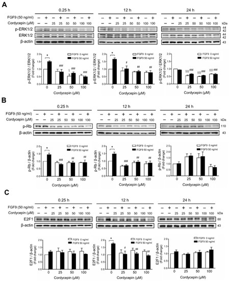 We next investigated whether cordycepin could suppress the signaling pathway induced by FGF9 in MA-10 cells. The results showed that FGF9-induced phosphor-ERK1/2 (p-ERK1/2) expression was significantly inhibited by cordycepin at 0.25 and 12 h after treatment (Figure 3A). At 24 h after FGF9 treatment, the phosphorylation of ERK1/2 was not elevated. However, the basal protein levels of p-ERK1/2 were significantly reduced by cordycepin (Figure 3A). The effects of cordycepin on the p-Rb/E2F pathway and the downstream signaling of ERK1/2 were also examined. Cordycepin (25, 50 and 100 µM) significantly inhibited FGF9-induced phosphorylation of Rb at 0.25 and 12 h, but not at 24 h after treatments (Figure 3B), and also inhibited FGF9-induced E2F1 expression 12 h after treatments (Figure 3C). These data indicated that cordycepin could inhibit FGF9-induced Rb phosphorylation and E2F1 overexpression, and subsequently suppress cell proliferation in MA-10 cells.