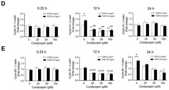 Cordycepin suppressed FGF9-induced expression of cyclin D1, cyclin E1, cyclin A1 and cyclin B1 in MA-10 cells. (A) Western blot analysis of cyclin D1, cyclin E1, cyclin A1 and cyclin B1 expression in MA-10 cells treated without or with FGF9 (50 ng/mL) and different concentrations of cordycepin (0, 25, 50 and 100 µM) for 0.25, 12 and 24 h. (B–E) The relative expression of (B) cycline D1, (C) cyclin E1, (D) cyclin A1 and (E) cyclin B1 was quantified using ImageJ software by normalization with β-actin. Values are shown as the mean ± SEM, n = 4. p values were calculated using two-way ANOVA with Tukey’s multiple comparisons post-tests. * p < 0.05, ** p < 0.01, compared to the control group (0 ng/mL FGF9) at each dose of cordycepin; §§ p < 0.01, §§§ p < 0.001 compared to the group with 0 μM cordycepin and 0 ng/mL FGF9 treatments; # p < 0.05, ### p < 0.001 compared to the group with 0 μM cordycepin and 50 ng/mL FGF9 treatments.