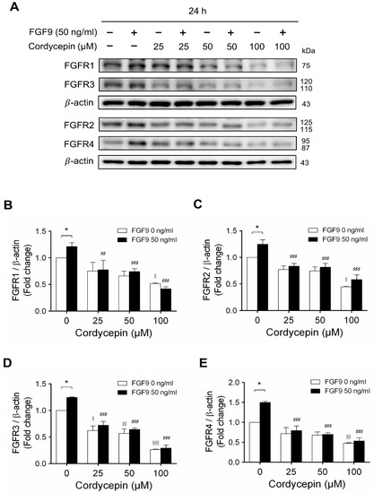 2.4. Cordycepin Decreased FGF9-Induced FGFR1-4 Expressions in MA-10 Cells