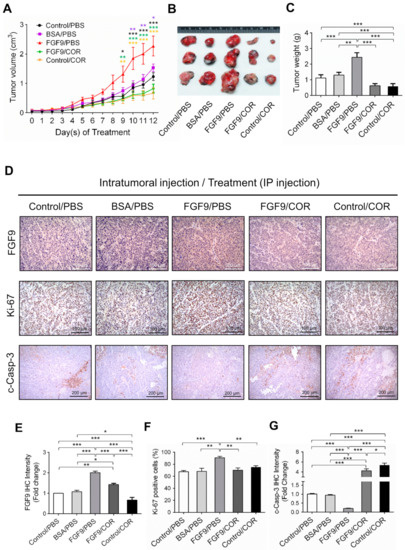 Cordycepin suppressed in vivo tumor growth in the C57BL/6J mouse model of FGF9-induced testicular tumorigenesis. Seven days after MA-10 cell inoculation, mice were randomly allocated to five groups (i.t./i.p.): Control/PBS, BSA/PBS, FGF9/PBS, FGF9/COR and Control/COR groups. In the control group, mice were inoculated with MA-10 cells and received no i.t. injection. (A) Tumor growth curves of the MA-10 tumor-bearing mice received different treatments, as indicated in the plots. (B) Photograph of excised MA-10 tumors and (C) tumor weights at the time mice were sacrificed. (D) The immunohistochemical (IHC) assay of the expression of FGF9, Ki-67 and cleaved caspase-3 (c-Casp-3) on MA-10 tumor tissue from Control/PBS, BSA/PBS, FGF9/PBS, FGF9/COR and Control/COR-treated mice (original magnification: FGF9 and Ki-67, x200; C-Casp-3, x100). (E–G) IHC quantification of the expression of (E) FGF9, (F) Ki-67 and (G) c-Casp-3 in MA-10 tumor tissue from (D). Quantification values are represented as the mean ± SEM, n = 5. p values were calculated using two-way ANOVA with Sidak’s multiple comparisons post-tests (A), *p < 0.05, ** p < 0.01, *** p < 0.001 with different color indicates a statistically significant difference at each time point compared to their corresponding control group; and one-way ANOVA with Tukey’s multiple comparisons post-tests (C,E–G), * p < 0.05, ** p < 0.01, *** p < 0.001. COR: cordycepin.