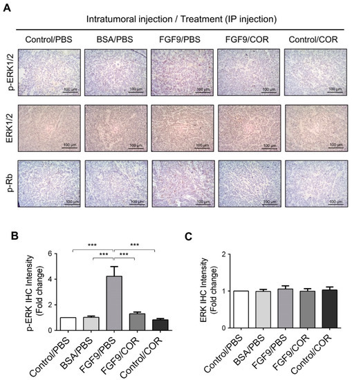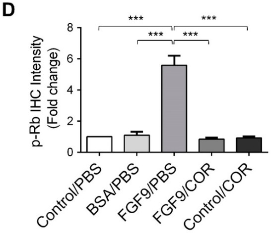 Cordycepin inhibited the phosphorylation of ERK1/2 and Rb in FGF9-induced allograft model. (A) The immunohistochemical (IHC) assay of the expression patterns of p-ERK1/2, total ERK1/2 and p-Rb in MA-10 tumor tissue from Control/PBS, BSA/PBS, FGF9/PBS, FGF9/COR and Control/COR treated mice (original magnification 200×). (B–D) IHC quantification of the expression of (B) pERK1/2, (C) total ERK1/2 and (D) p-Rb in MA-10 tumor tissue from (A). Quantification values are represented as the mean ± SEM, n = 5. p values were calculated using one-way ANOVA with Tukey’s multiple comparisons post-tests, *** p < 0.001. COR: cordycepin.