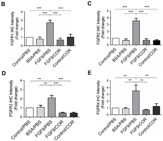 Cordycepin reduced the expression of FGFR1-4 in FGF9-induced allograft model. (A) The immunohistochemical (IHC) assay of the expression patterns of FGFR1, FGFR2, FGFR3 and FGFR4 in MA-10 tumor tissues from Control/PBS, BSA/PBS, FGF9/PBS, FGF9/COR and Control/COR treated mice (original magnification 200×). (B–E) IHC quantification of the expression of (B) FGFR1, (C) FGFR2, (D) FGFR3 and (E) FGFR4 in MA-10 tumor tissue from (A). Quantification values are represented as the mean ± SEM, n = 5. p values were calculated using one-way ANOVA with Tukey’s multiple comparisons post-tests, ** p < 0.01, *** p < 0.001. COR: cordycepin.