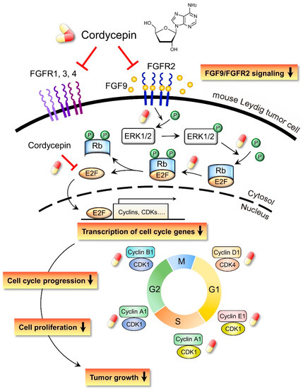 In the present study, we have a novel finding that cordycepin inhibited MA-10 cell proliferation in vitro and tumor growth in vivo through suppressing the FGF9 signaling pathway, which upregulated the phosphorylation of ERK1/2 and Rb, the expressions of E2F1 and the cell cycle related proteins, cyclins and CDKs (Figure 10).