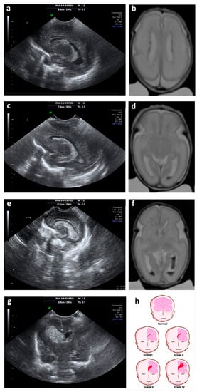 Ultrasound and magnetic resonance imaging (MRI) showing different grades of GM-IVH. (a) Parasagittal cerebral ultrasound through lateral ventricles shows grade I hemorrhage; (b) T2-weighted axial MRI shows grade I hemorrhage on both lateral ventricles; (c) parasagittal cerebral ultrasound through lateral ventricles shows grade II hemorrhage; (d) T2-weighted axial MRI shows grade II hemorrhage on the left lateral ventricle; (e) parasagittal cerebral ultrasound through lateral ventricles shows grade III hemorrhage; (f) T2-weighted axial MRI shows grade III hemorrhage on the left lateral ventricle and grade II hemorrhage on the right lateral ventricles; (g) coronal cerebral ultrasound shows grade IV or periventricular hemorrhagic infarction; (h) cartoon representing ultrasound classification of the germinal matrix-intraventricular hemorrhage (GM-IVH).